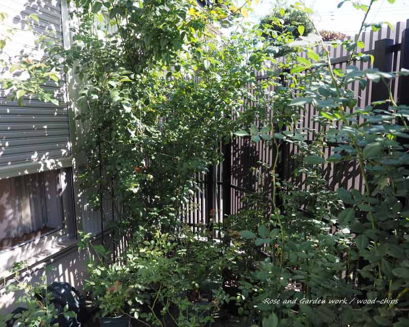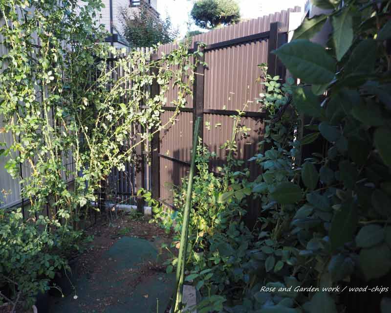 奥のフェンスでも枝が絡んで込み入っていましたが、おおむね解して枝の流れを整えました。