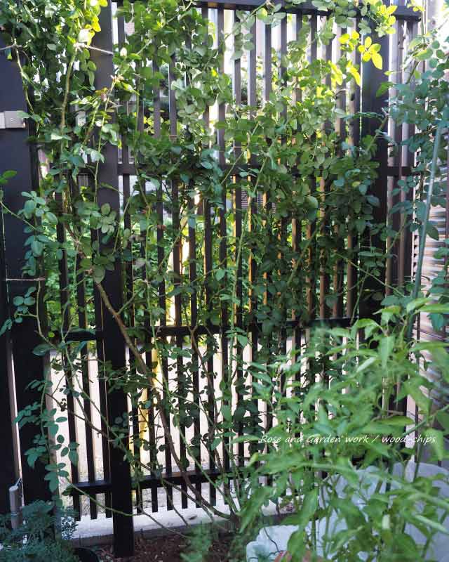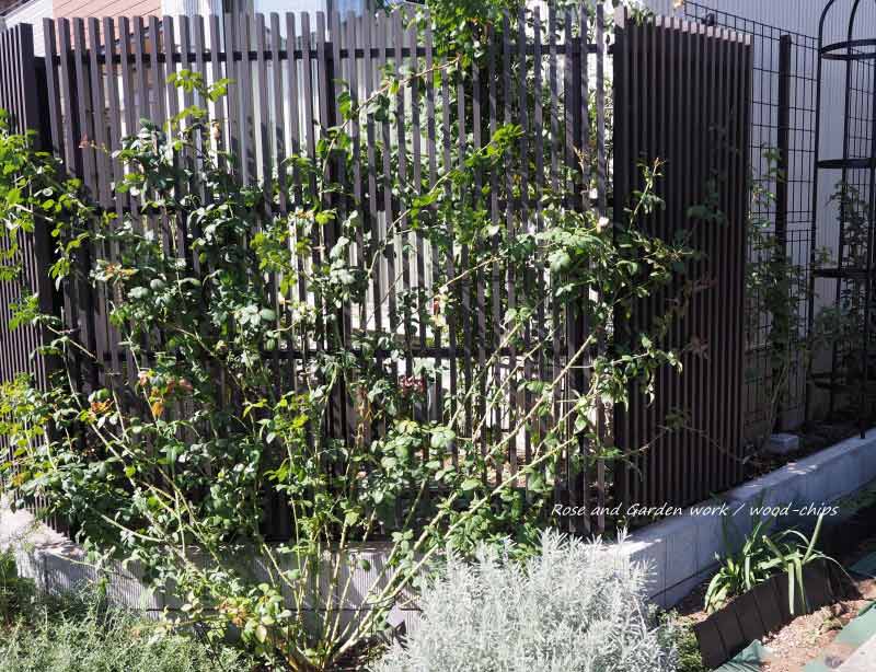 夏の成長期から一気に伸びたと思われ、フェンスにまとめられているバラの枝。