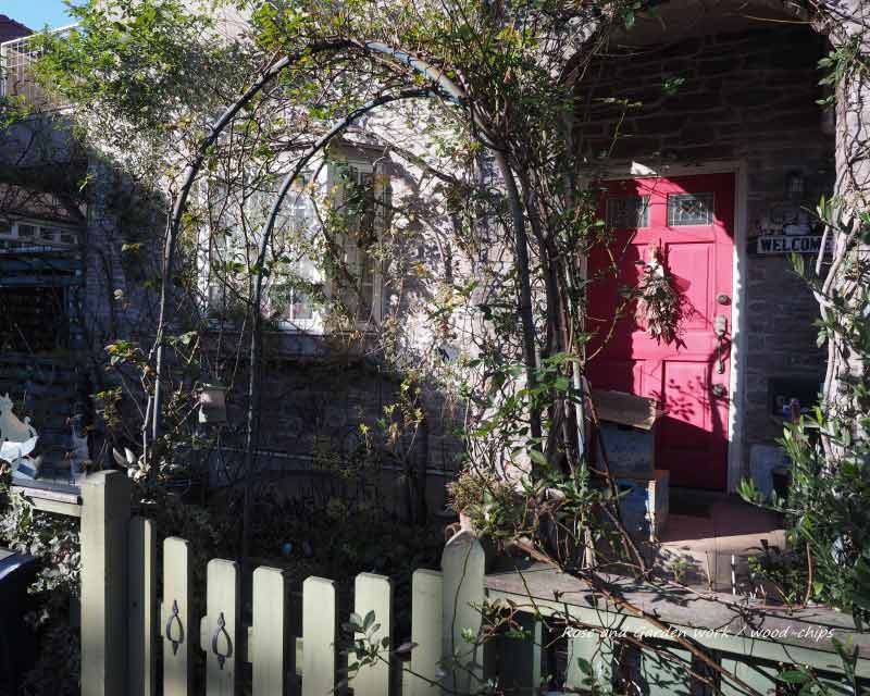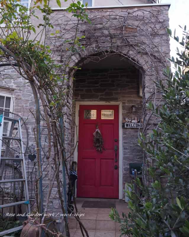 今年は、エントランスのポーチにあたる壁面に誘引している、ランブラーローズ(ヴィオレット)から手入れを始めました。