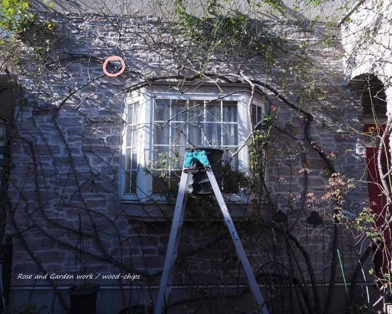 エントランス壁面のヴィオレットを仕立て終え、中央壁面のつるバラの仕立てに移ります。
